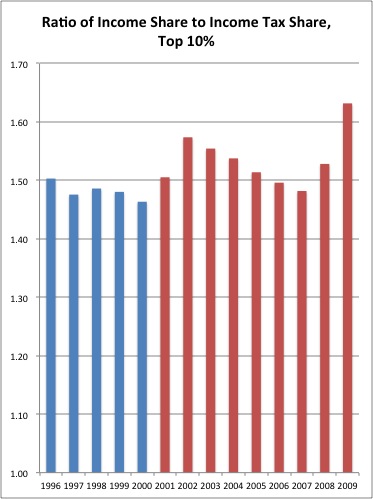 You can see a sharp increase in that ratio after Bush’s tax cuts — meaning the wealthy were increasing their share of taxes more than they were increasing their share of income. The ratio dropped later in the Bush years, but you can see the ratio is clearly higher under Bush than under Clinton.
