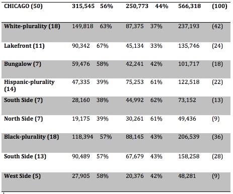 I have added the results from each of the 50 wards, characterizing them as white-, Hispanic- or black-plurality as Chicago does. I note that two wards which according to census data were white-plurality in 2010 are listed as Hispanic-plurality now; I presume that is the result of significant population shifts. I have further divided these three groups of wards into two each: Lakefront (wards 2, 32, 40, 42-44, 46-50) and Bungalow (1, 11, 19, 38-39, 41, 45) for white-plurality; South Side (10, 12-15, 22-23, 25) and North Side (26, 30-31, 33, 35-36) for Hispanic-plurality; and South Side (3-9, 16-18, 20-21, 34) and West Side (24, 27-29,37) for black-plurality). My numbers will be a little off from the official totals because they are based on 99 percent of precincts reporting and also because of possible arithmetic errors; but the discrepancies seem sure to be insignificant.