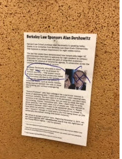 The dean of Berkeley Law School, Erwin Cherwinsky, sent a letter condemning the swastika: “Several of our students expressed their disagreement with [Dershowitz] and did so in a completely appropriate way that led to discussion and dialogue. I was pleased to hear of how this went, but then shocked to learn of the swastika drawn on a flyer that someone had posted about him.”
