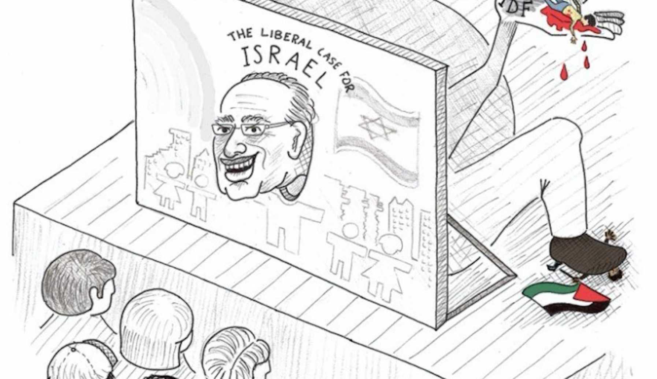 Shortly after, The Daily Californian, Berkeley’s student newspaper, published an anti-Semitic cartoon, depicting an ugly caricature of me sticking my head through a cardboard cut-out. Behind the cardboard, I am portrayed stomping on a Palestinian child with my foot, while holding in my hand an Israeli soldier who is shooting an unarmed Palestinian youth. Above the cardboard cut-out, the title of my speech – “The Liberal Case for Israel” – is scrawled in capital letters.