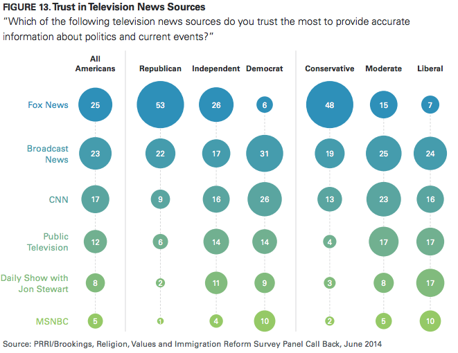 Even 26 percent of Independents listed Fox as their most trusted television news source, with just 4 percent listing MSNBC. Nearly three times as many Independents trust the “Daily Show” than MSNBC. Perhaps this is why MSNBC lost nearly a quarter of its prime-time audience in 2013, and 15.5 percent of its daytime audience, while Fox News has more viewers than both MSNBC and CNN combined.