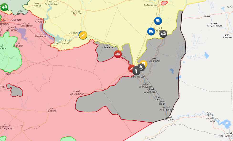 Note the conflagration of U.S.-supported forces in yellow, axis forces in red, and ISIS forces in grey. Following the line of ISIS-held settlements down the Euphrates river, you’ll end up at the Iraqi border town of Al Qa’im. As I’ve explained, Al Qa’im is the pivot on which U.S. interests in stability or axis interests in imperialism rest. Put simply, if we care about counter-terrorism, we must care about not yielding to the axis. Trump must stand up to Putin here.