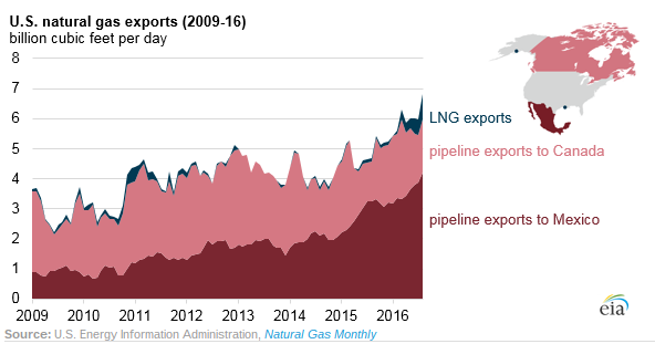 Mexico currently imports more than 4 billion cubic feet of natural gas per day from the U.S. through pipelines, using about two-thirds of current capacity. They’d love to import a lot more from us, so that they can stop buying it at much higher prices in liquid form from other countries.
