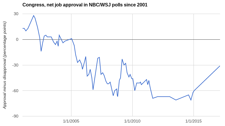 The latest NBC/Wall Street Journal poll has the public approval rating of Congress at 29 percent, with 60 percent disapproving. That might not sound great, but this is the highest approval rating and the lowest disapproval that any Congress has gotten since 2009 in this poll.