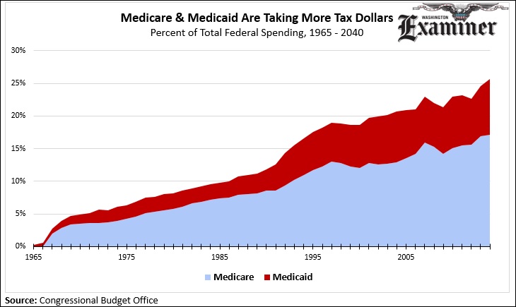 Together, Medicare and Medicaid take up more than one-quarter of every federal dollar spent. That’s more than double the portion they took up 23 years ago. Medicare is more than twice the size of Medicaid.