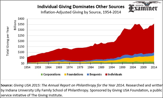 Individuals alone donated $258 billion in 2014, 15 times more than the $17.8 billion given by corporations. Money given by all types of sources — individuals, foundations, bequests and corporations — has risen after adjusting for inflation. Individuals give roughly 72 percent of all donations, but that has fallen from 84 percent in 1954. The fastest-rising type of giving is from foundations, which has increased 17.5 times since 1954.