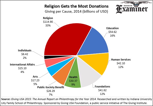 Religious institutions received $115 billion in 2014, one-third of all giving and twice as much as the next most popular cause. Less than 10 cents of every dollar donated went to health-related causes, while the arts received 5 cents. The giving category that received the least amount of giving was individuals, who received only $6 billion in 2014.