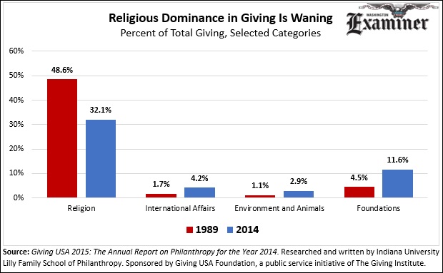 It’s not that donations to religious institutions are dropping, but rather that gifts to non-religious causes are rising faster. A quarter-century ago, religious giving made up almost half of all donations. Today, it’s down to one-third. Its decline has been shared widely across the giving categories, but especially by foundations, which now make up 12 percent of every dollar donated, up from 5 percent in 1989. The portion of giving to environmental causes has nearly tripled, to 3 percent.