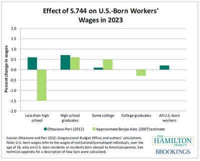 Second, should immigration reforms as it exists in Congress pass, it could have a negative effect on wages for at least one segment of U.S.-born workers, according to the Brookings Institution’s Hamilton Project.