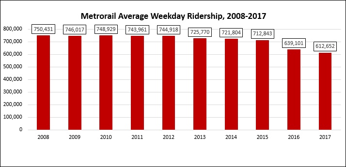 Ridership has fallen for the past five years in a row, despite the Silver Line opening in 2015 with five new stations and, presumably, access for new riders.