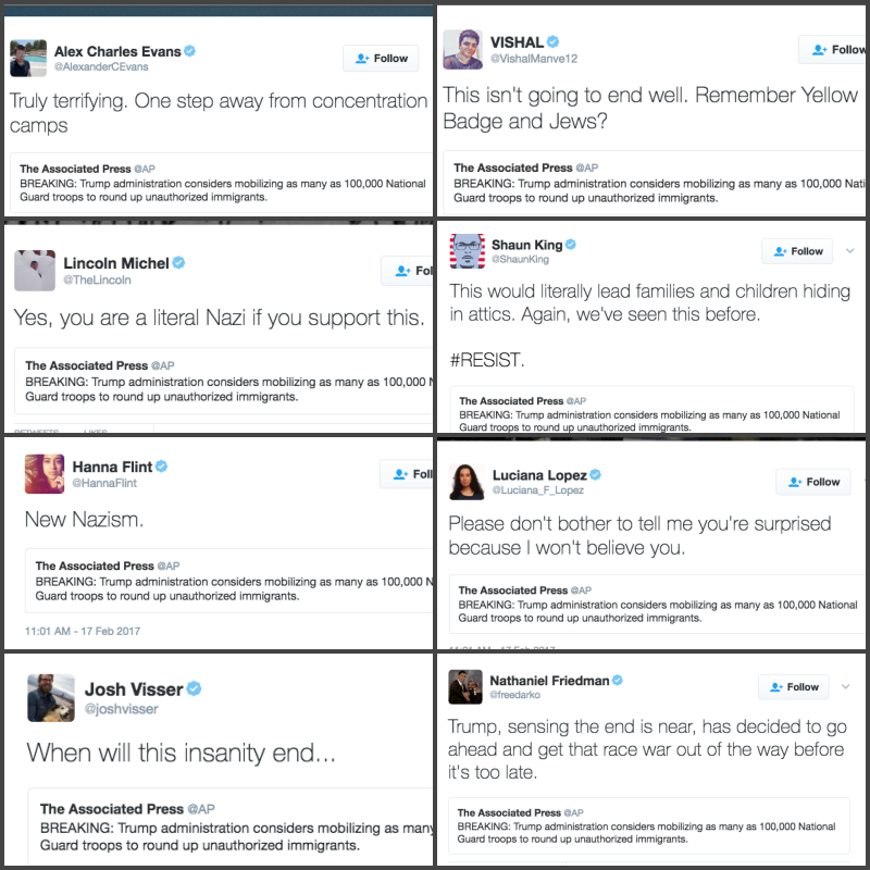 But by mid-afternoon Friday, long after the story had been called into question, the news group’s social media account was still pushing the headline, “Trump weighs mobilizing National Guard to round up unauthorized immigrants in 11 states.”