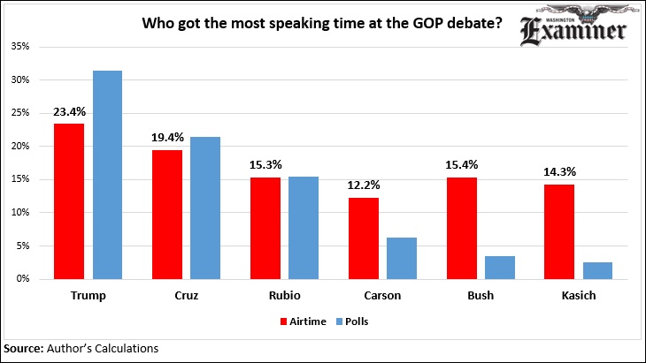 With six people in the debate, Trump spoke for nearly one-fourth of the time. Cruz had one-fifth. Behind those two were Jeb Bush, Rubio and John Kasich, who each had between 10 and 11 minutes of speaking time. Ben Carson spoke for the least amount of time in the fourth straight debate. He spoke for 8.6 minutes, just more than half of the time Trump spoke.