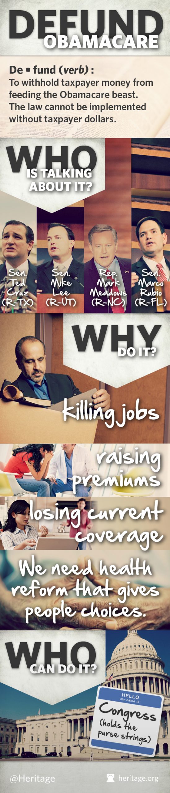 Graphic: Heritage explains how to defund Obamacare By Charlie Spiering July 29, 2013 4:00 am FacebookTwitterEmailPrint Add Washington Examiner on Google FacebookTwitterEmailPrint Heritage shares a cool graphic this morning illustrating how and why Congress can defund Obamacare: Recommended Stories Trump's UFO order will mean videos and reports, but no alien cover-upThe battle between Kari Lake and her Iran broadcasting criticsAmerican patriotism shines on the Olympic stage TagsAffordable Care ActAnalysis Related Content Finance and Economy JPMorgan admits it closed Trump’s accounts shortly after Jan. 6 Senate Schiff ditching Trump’s State of the Union address for counter rally World US sent hospital ship to Greenland, Trump says Senate Elizabeth Warren accuses Trump of ‘stealing’ from Americans with tariffs Congressional Trump yanks endorsement from Colorado Republican over tariff vote