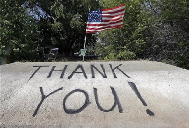 4) Strong wind snaps the American flag above a message painted on a boat launch ramp on the shore of Hughes Lake, where helicopter pilots picking up water from the lake can see it, as the fight against what has been called the Powerhouse fire in Lake Hughes, Calif., continues late Sunday afternoon, June 2, 2013.
