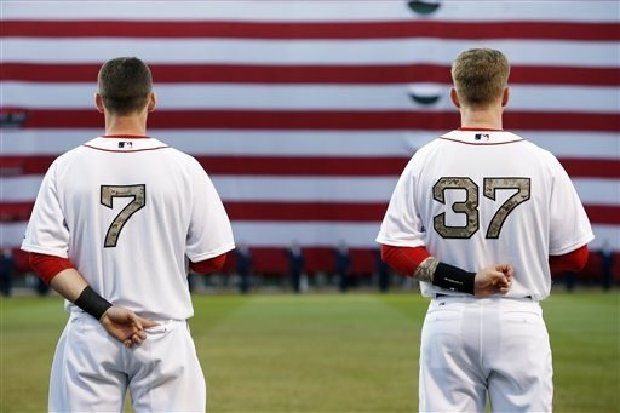 15) Boston Red Sox’s Stephen Drew (7) and Mike Carp (37) stand during the national anthem as a giant flag hangs from the left field wall to commemorate Memorial Day before a baseball game against the Philadelphia Phillies in Boston, Monday, May 27, 2013.