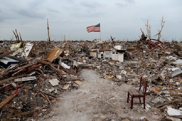 19) MOORE, OK – MAY 24: An American flag flies over the rubble of a destroyed neighborhood on May 24, 2013 in Moore, Oklahoma.