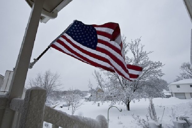 22) MERRIAM, KS – FEBRUARY 26: Strong winds and snow whip a flag on the porch of a home after a snowstorm hit the midwest February 26, 2013 in Merriam, Kansas. This is the second major snowstorm the midwest has seen this week dropping a half-foot or more of snow across Missouri and Kansas and cutting power to thousands.