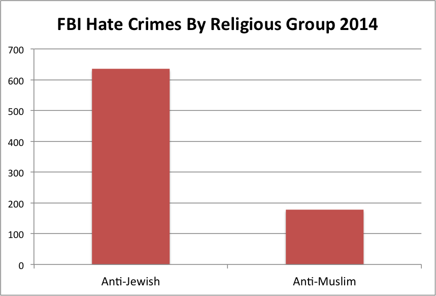 In 2014, the FBI reported 1,092 hate crimes based on religious bias — 58 percent of those crimes were against Jews, compared with 16 percent that were against Muslims.