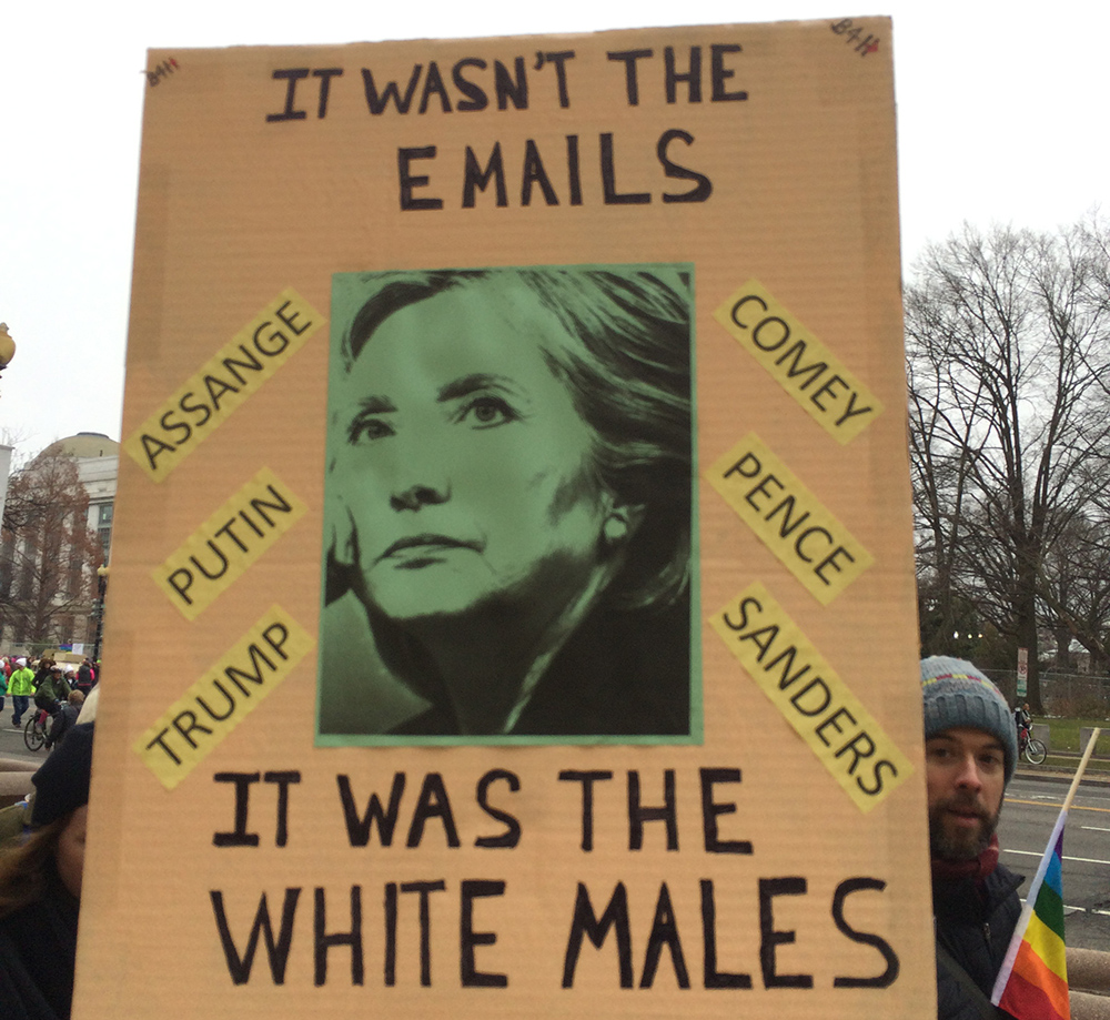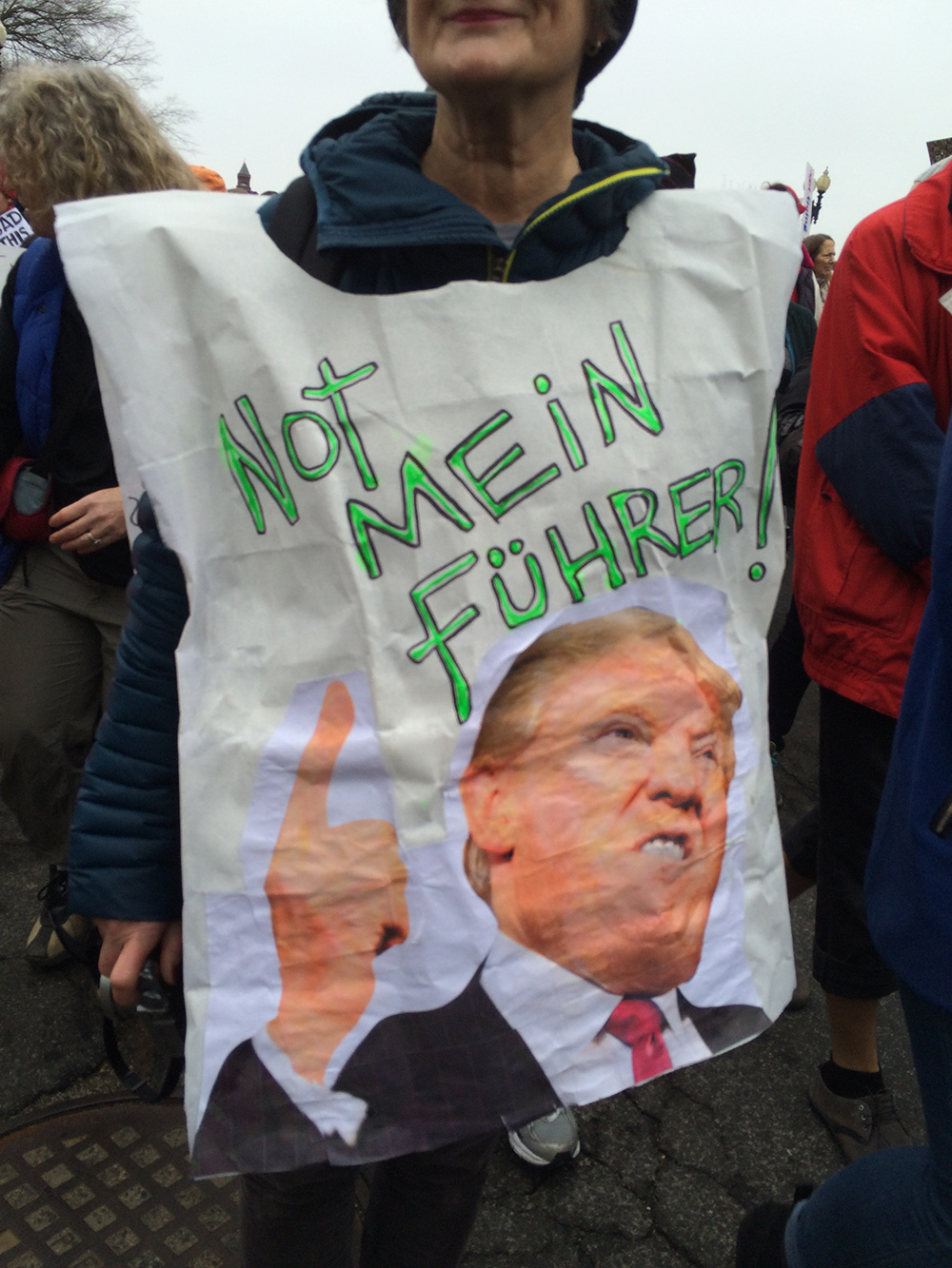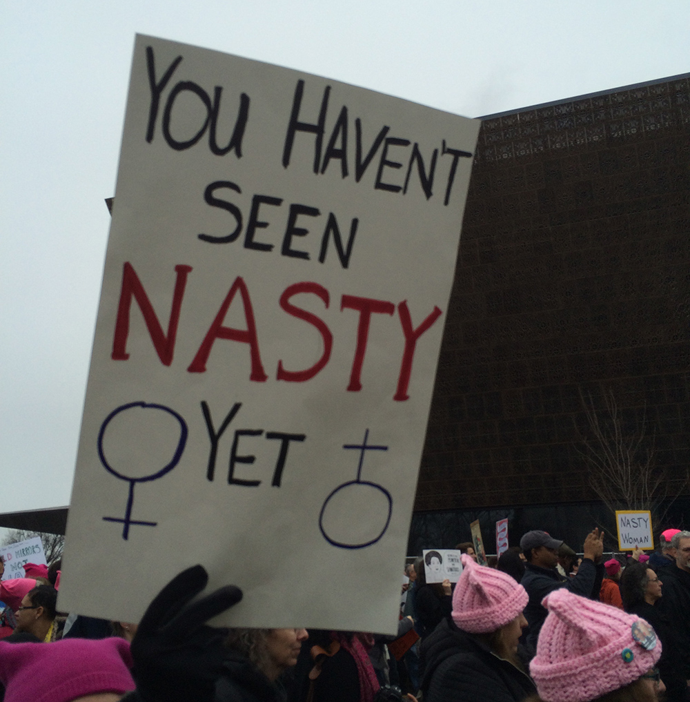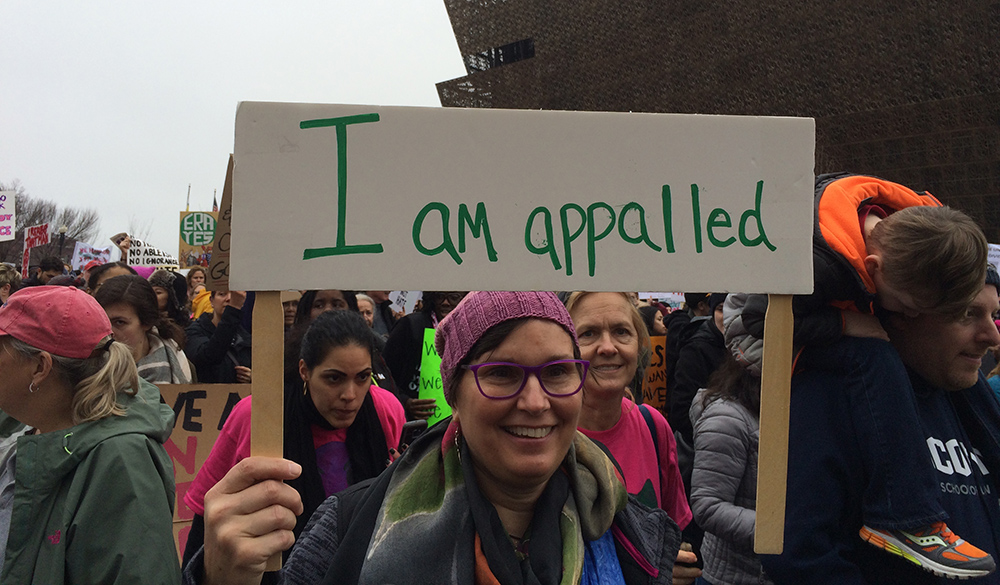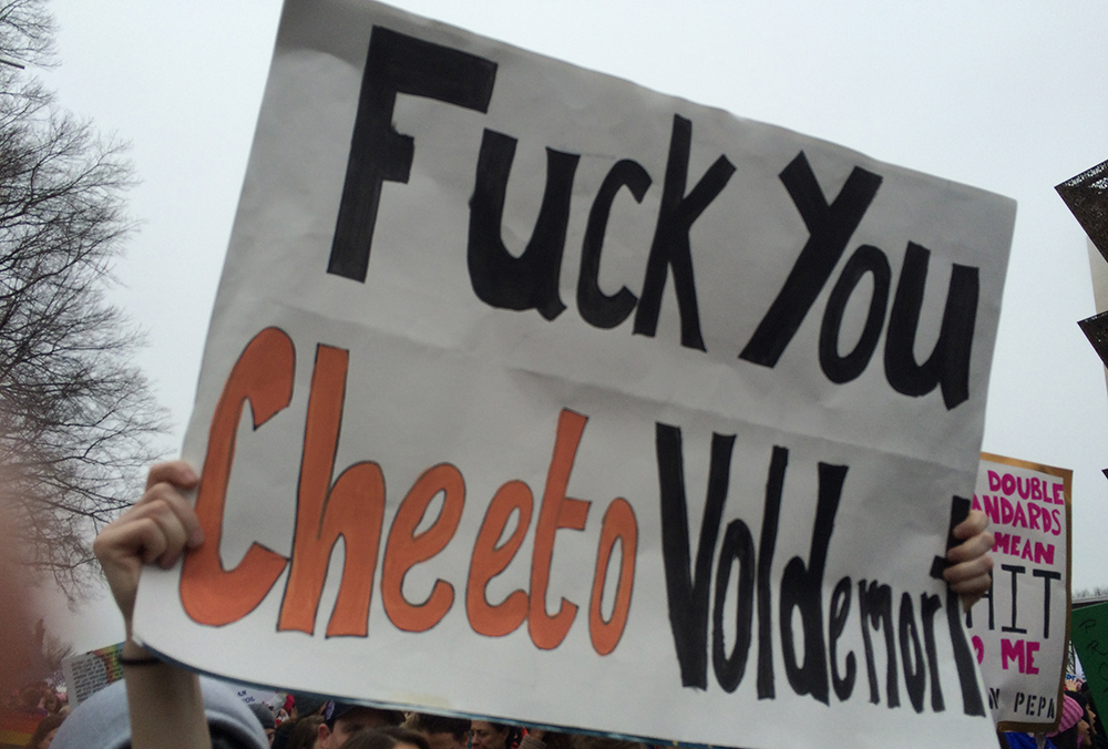 The Women’s March wasn’t that. There were zillions of signs, and only a tiny minority were professionally done. Instead, nearly all the signs were homemade, apparently heartfelt expressions of deep feelings on the part of the marchers. Some of the signs seemed angry, but the people carrying them mostly did not. Many of the signs were all over the lot, plain-vanilla denunciations of Donald Trump or Republicans; there were immigration-based signs, gun control-based signs, Muslim rights-based signs, signs about Trump’s combover.