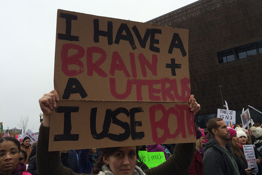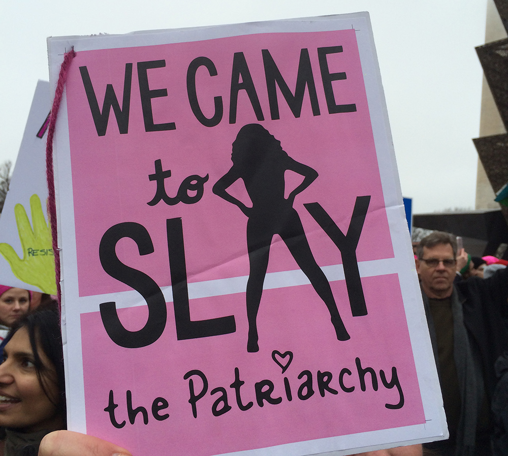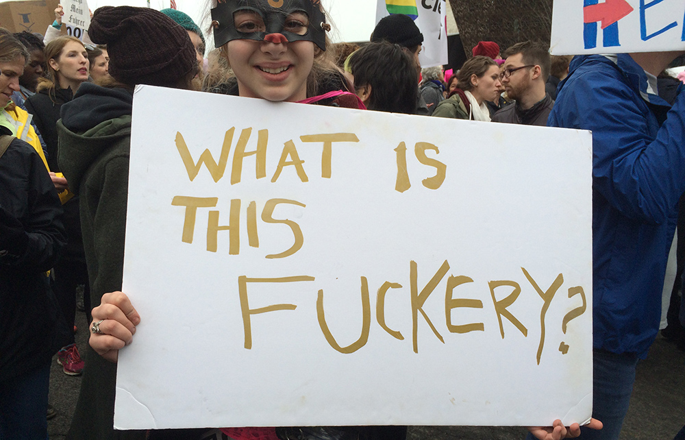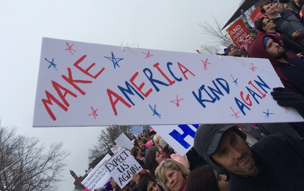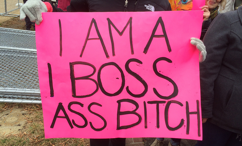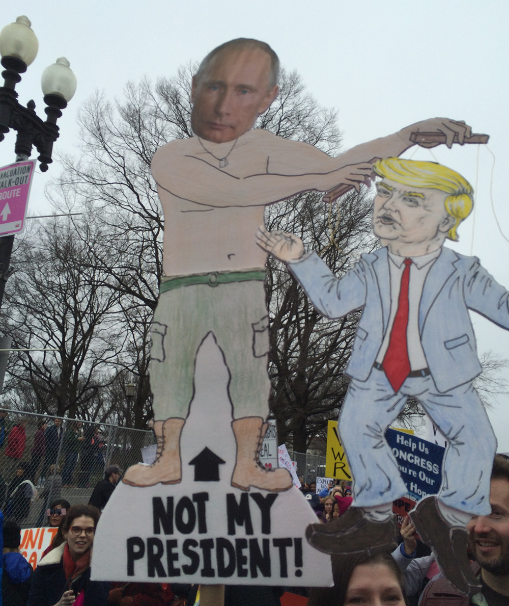 The Women’s March wasn’t that. There were zillions of signs, and only a tiny minority were professionally done. Instead, nearly all the signs were homemade, apparently heartfelt expressions of deep feelings on the part of the marchers. Some of the signs seemed angry, but the people carrying them mostly did not. Many of the signs were all over the lot, plain-vanilla denunciations of Donald Trump or Republicans; there were immigration-based signs, gun control-based signs, Muslim rights-based signs, signs about Trump’s combover.
