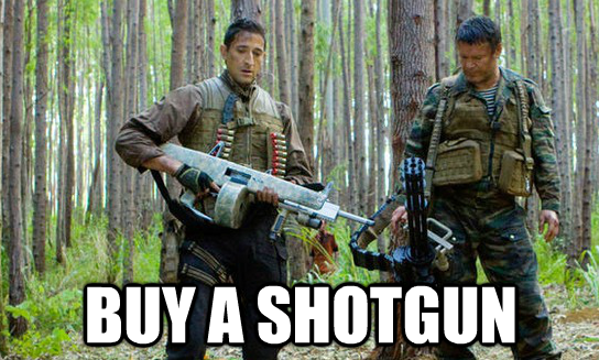 14. Hunting Predators? Adrian Brody uses an AA-12 automatic shotgun