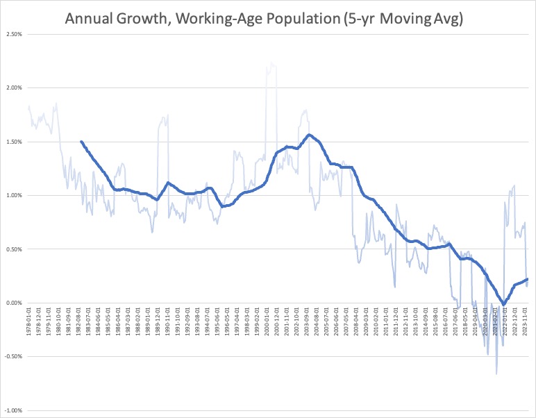 The working-age population in the U.S. used to grow at a steady clip. Now it’s basically flat. From 1980 until the Baby Bust began in 2008, our working-age population was growing between 1% and 1.5% per year. (There were bumps in the road, and so the below chart uses 5-year-rolling averages.) Nowadays, the working-age population is growing at about 0.2% — as much growth in five years as we used to get in one year.
