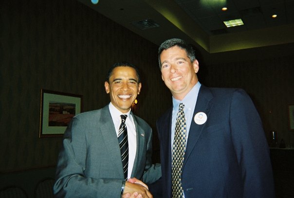 Across the country in New Mexico, however, some observers recognized a former Albuquerque city councilman and Democratic politician named Michael Cadigan. (He is the tall white man with salt-and-pepper hair standing behind Obama, in the top left corner of the photo below.) Cadigan, a former Marine, was an early supporter of Obama’s 2008 campaign, appearing with then-Sen. Obama at a campaign event and contributing $500 to the Obama effort. He has also been a small donor to the progressive activist group Act Blue.*