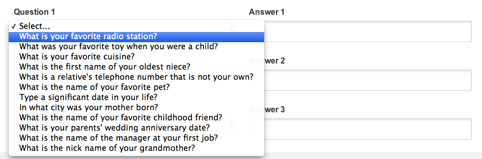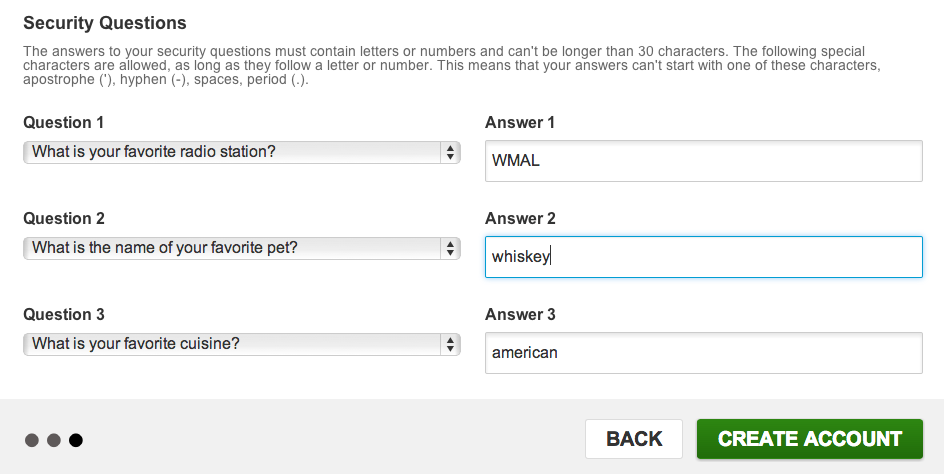 Step 4: Security questions: Lots of options here, but I need to pick three