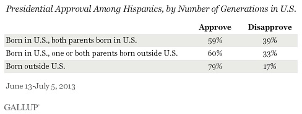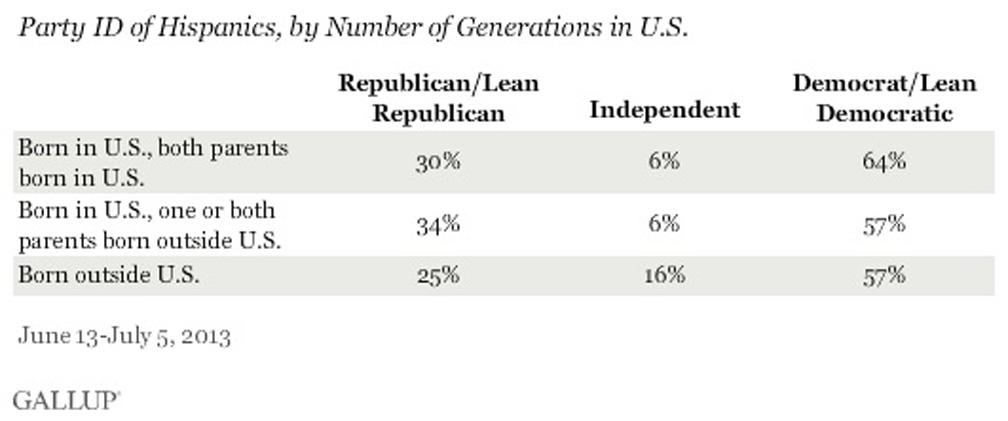 Bad news for the GOP: U.S.-born and immigrant Hispanics lean Democratic by a large margin and approve of President Obama, according to a new Gallup poll. Among U.S.-born Hispanics with both parents born in the U.S., 64 percent are Democrats or lean Democratic, compared to just 30 percent who identify as Republican or lean Republican. For U.S.-born Hispanics with one or both parents born outside the U.S., the trend is similar: 57 percent trend Democratic while 34 percent trend Republican.
