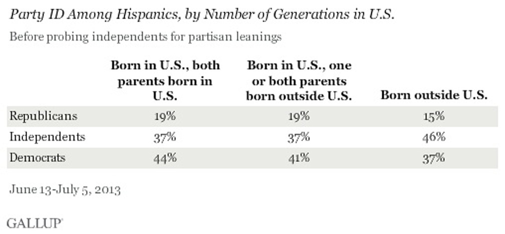 The numbers are just as bad before independents were asked their political leanings. Forty-four percent of U.S.-born Hispanics with both parents born in the U.S. identify as Democrats, with just 19 percent identifying as Republicans.