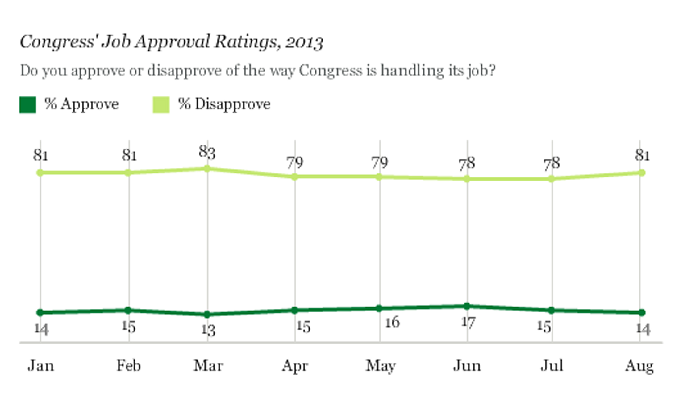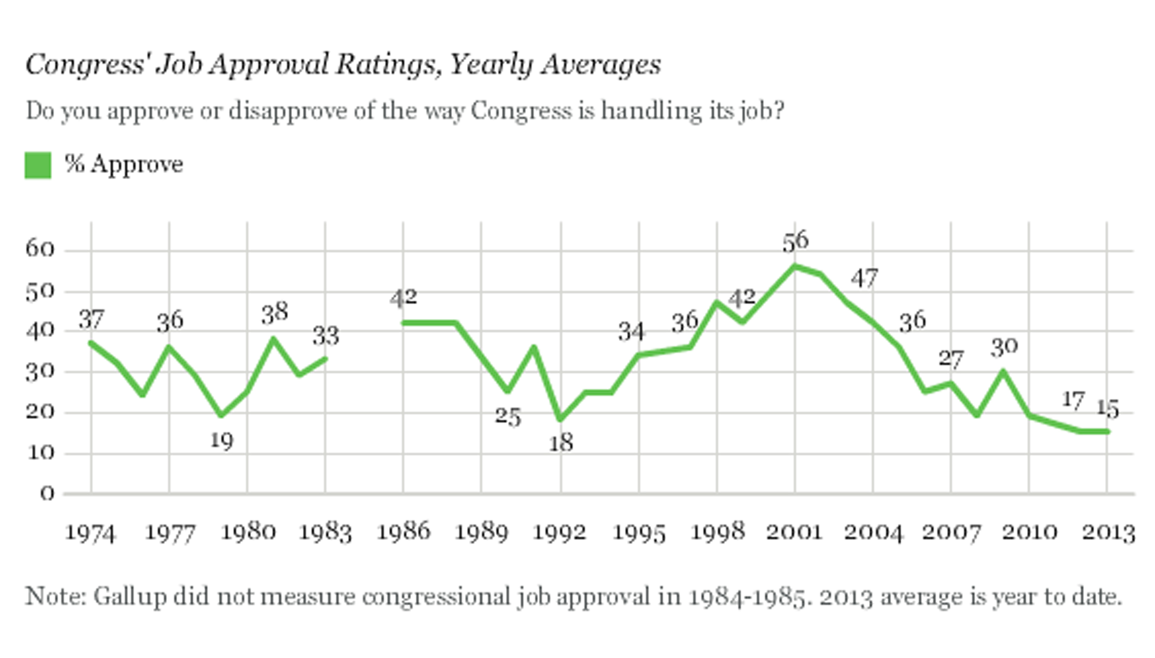 Congress’s approval so far has averaged 15 percent in 2013, tied with 2012 for the lowest approval since 1974 — when Gallup began keeping track.