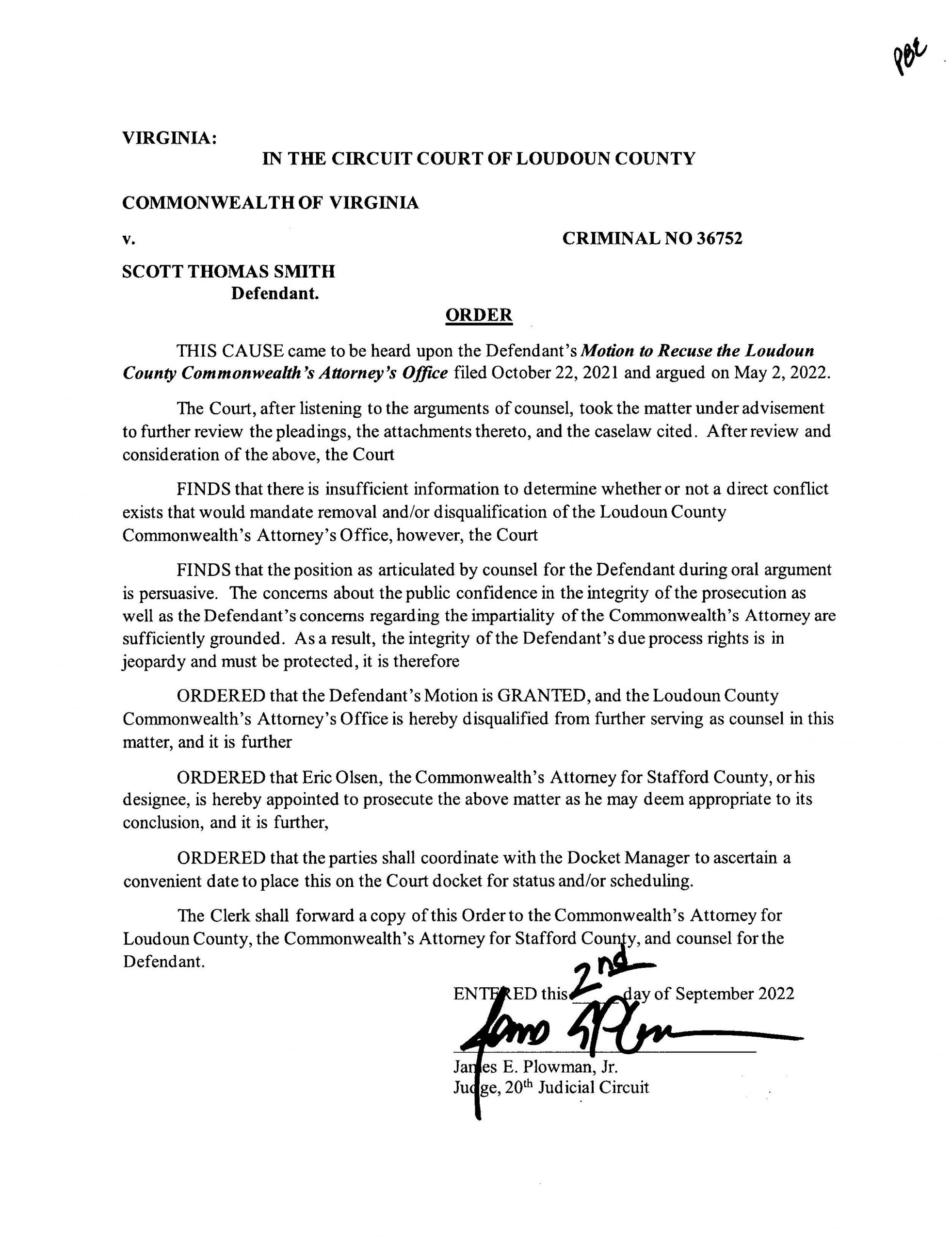 To most reasonable observers, Biberaj’s fevered obsession with punishing Smith seems not like justifiable prosecution but persecution. That’s pretty close to what Virginia Circuit Judge James F. Plowman thought as well. In reply to a motion by Smith’s attorneys to remove Biberaj from the case, Plowman agreed. “The concerns about public confidence in the integrity of the prosecution,” he wrote, “as well as the defendant’s concerns regarding the impartiality of the Commonwealth’s Attorney are sufficiently grounded.” Plowman removed Biberaj from Smith’s case and appointed a neighboring county prosecutor to decide whether to prosecute it further.