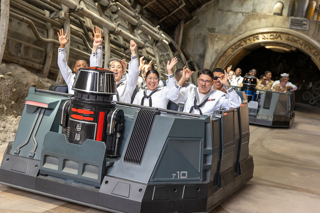 The active-duty troops, primarily from the U.S.S. Carl Vinson, participated in the resort’s daily flag retreat ceremony that included a march through the park, experienced attractions at Star Wars: Galaxy’s Edge, and met some famous Disney characters.
