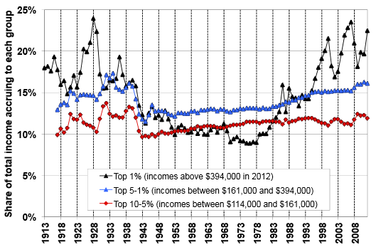 In 2012, Saez writes, the top 10 percent of earners took home just over 50 percent of all income earned in the U.S. when capital gains are taken into account, a level that is “higher than any other year since 1917 and even surpasses 1928, the peak of stock market bubble in the “roaring” 1920s.”