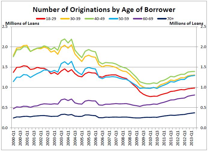 The number of auto loans made to Americans aged 18-29 (represented by the red line in the chart below) has not shown much of a recovery following the recession, leading officials to wonder if young consumers are not as interested in owning cars as previous generations were. Another possibility is that rising student loan debt has crowded out other forms of borrowing.