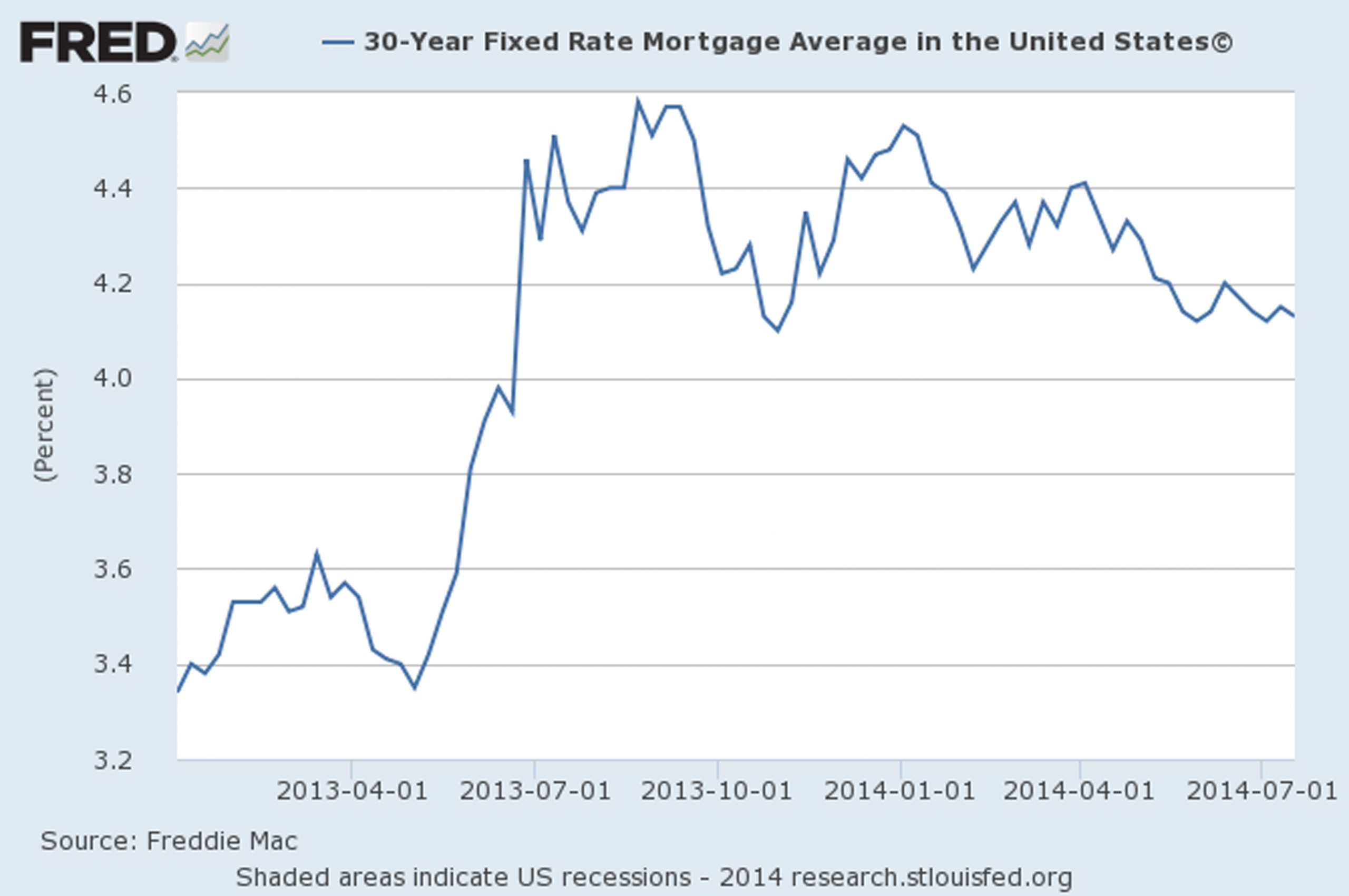 What’s mysterious about the weakness in housing in 2014 is that some of the obvious factors that would slow down activity are missing. In particular, mortgages rates have been drifting downward during the year.