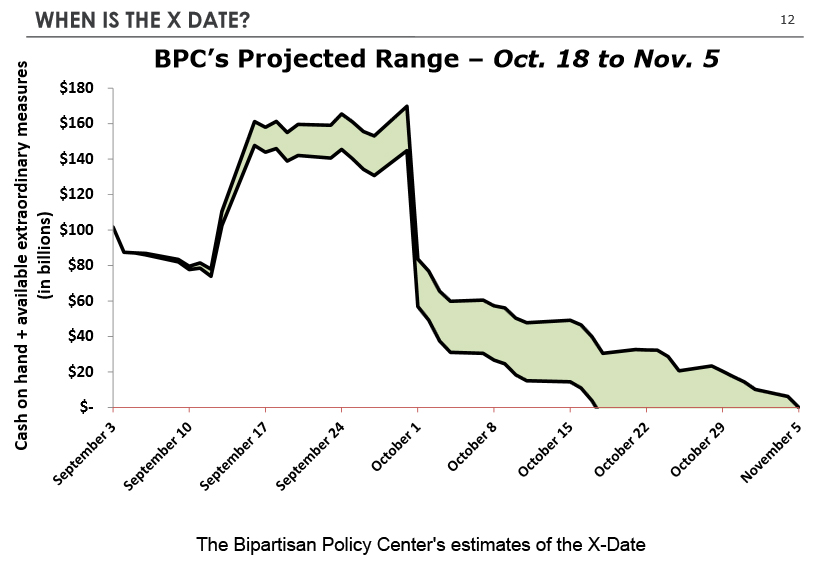 Estimates of the exact X-Date differ. Analysts at Credit Suisse pegged the date as sometime as late as mid-November. But the Bipartisan Policy Committee’s projections are the most comprehensive available to Congress and the public.