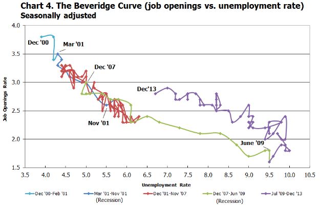 The relationship between unemployment and job openings is represented in what economists know as the Beveridge Curve. The U.S. recovery has seen a rightward shift in the Beveridge Curve, meaning that there there have been more job openings at every value of the unemployment rate: