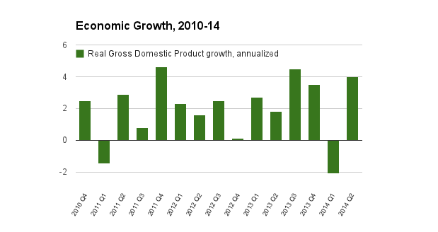 The BEA’s revised statistics show that the gross domestic product, adjusted for inflation, grew at an annual rate of about 4 percent in the second half of 2014 — faster than any other two-quarter period during the economic expansion that began in the second half of 2009. The updated data, which includes more information on economic output over the past few years, show that growth was stronger in 2013 than previously thought, thanks to consumers and state and local governments spending more than previously realized.