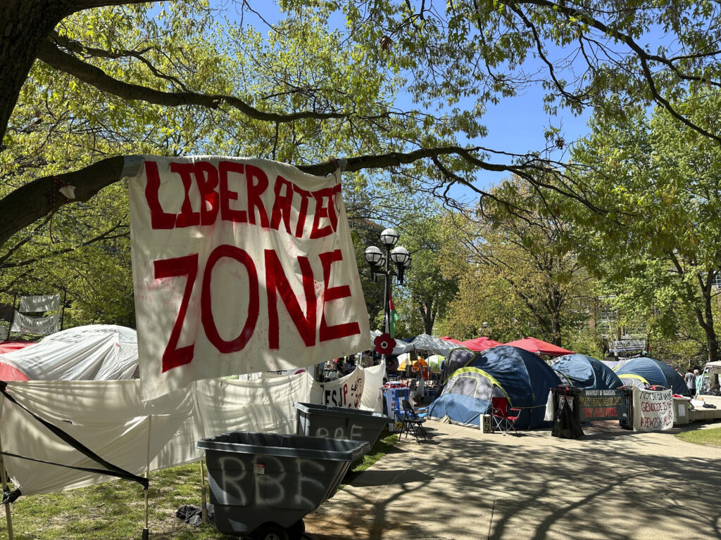Among the protest signs were “UM funds genocide,” “Free Free Palestine,” and “ACAB,” an anti-police slogan.