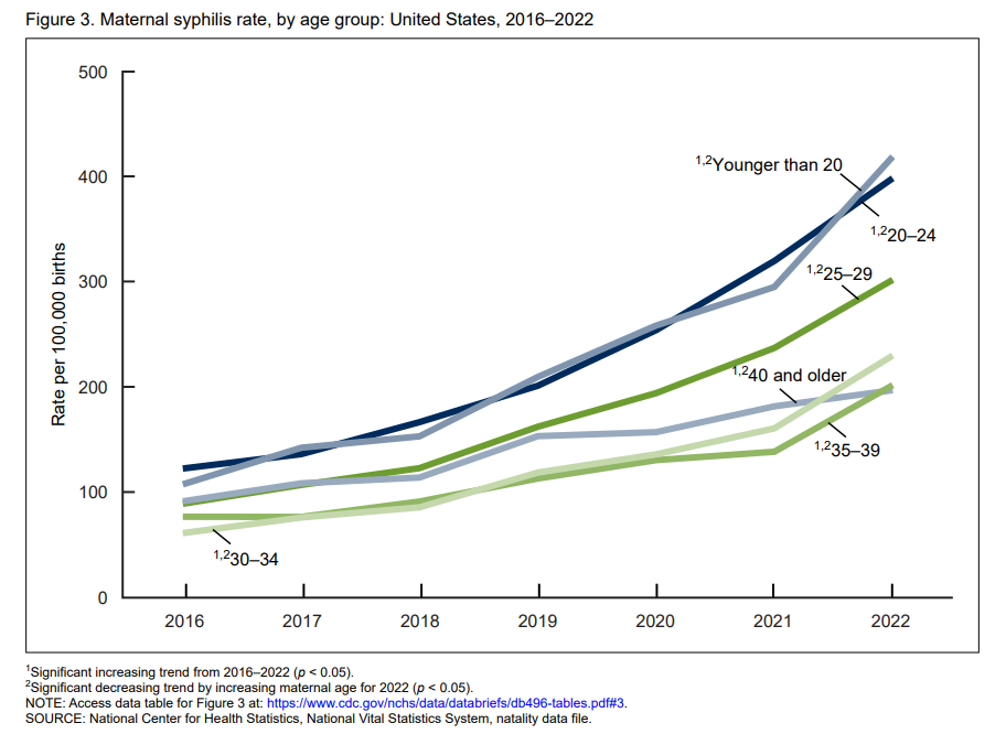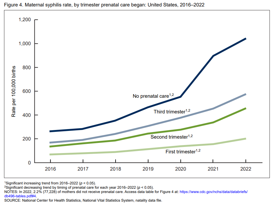 Although syphilis infections in the U.S. have increased every year since 2000, rates of maternal syphilis more than tripled between 2016 and 2022.