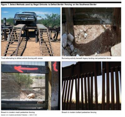 The GAO found that older, “legacy” fencing, has been easily beaten by illegals. Sometimes they dig under it or cut a hole in it. Some lower fences are breached by the construction of makeshift bridges, allowing cars and trucks to flow over. Parts of the fencing is so old that debris has build up at the bottom, making it easy to climb over. And finally, the GAO said that huge groups of illegals can beat older fencing.
