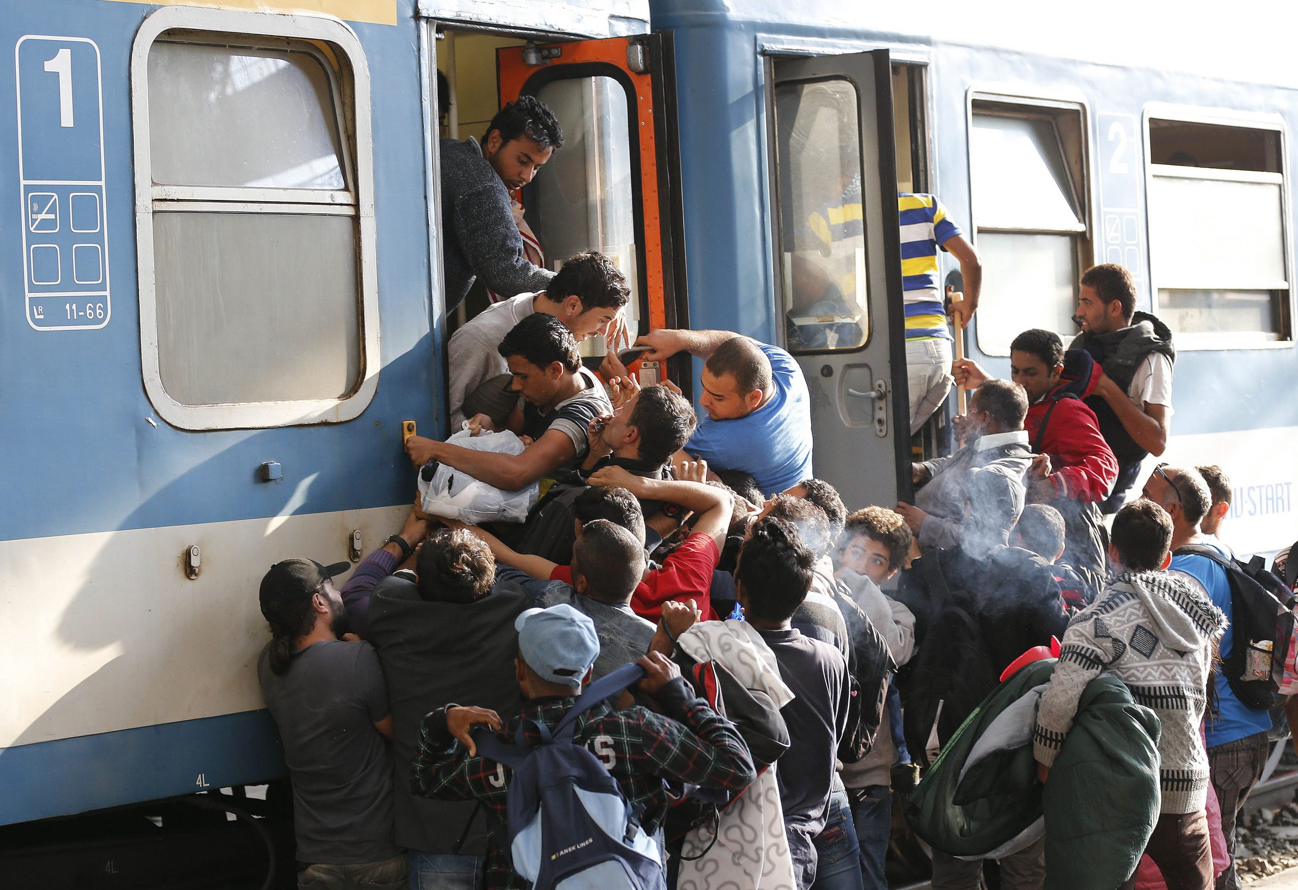 Migrants struggle to board a train at the railway station in Budapest, Hungary.(AP Photo/Frank Augstein)
