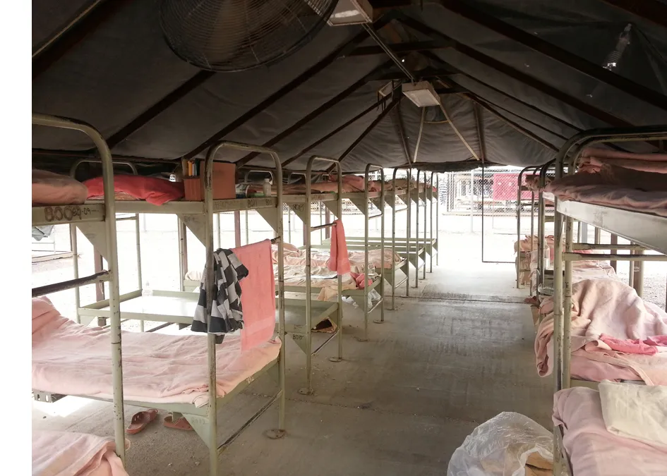 The first thing one notices about Tent City is the proliferation of pink. From every bunk hangs a pink towel — “why give them a color they like?” reasoned Arpaio — dotting the otherwise bleak desert landscape with artificial optimism.