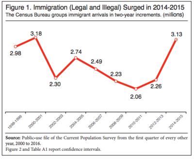 Camarota’s 17-page analysis said that immigration over the last two years reached 3.1 million, or more than 1.5 million annually. In the prior two years, 2012-2013, 2.3 million arrived or about 1.1 million each year.