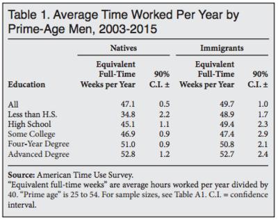 — Native-born high school dropouts worked an average of 1,391 hours (the equivalent of about 35 full-time weeks) per year between 2003 and 2015, while immigrant dropouts worked 1,955 hours (or 49 full-time weeks) per year.