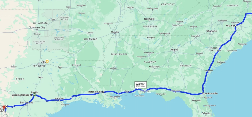 One bloc of the caravan departed Virginia Beach, Virginia, on Monday with scheduled stops in Jacksonville, Florida, and Baton Rouge, Louisiana. The group was slated to leave Louisiana for Dripping Springs, Texas, for a Thursday evening pep rally.
