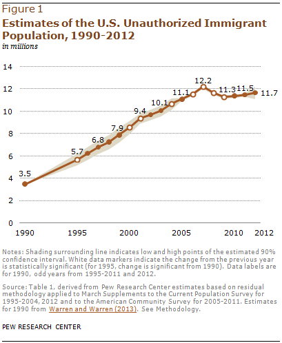 At the peak, there were 12.2 million illegal immigrants in the United States in 2007, the start of the recession. Just two years later, it dropped to 11.3 million. And now Pew said that there are 11.7 million unauthorized immigrants in the U.S. The non-partisan research center said that 21 percent of all 41.7 million immigrants in the United States are illegal, and 52 percent of the illegal population comes from Mexico. The up swing comes as the nation’s economy is leveling off, providing some jobs at low income levels.