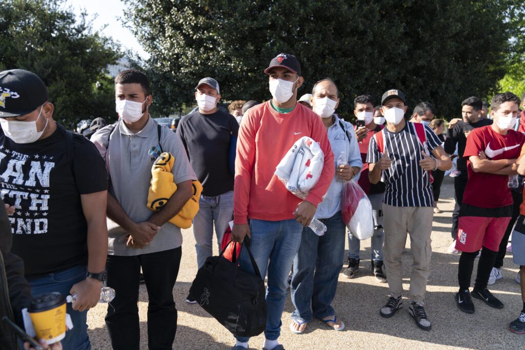 Immigrants hold Red Cross blankets after arriving at Union Station in Washington near the U.S. Capitol on buses from Texas on April 27, 2022. (AP Photo/Jose Luis Magana)