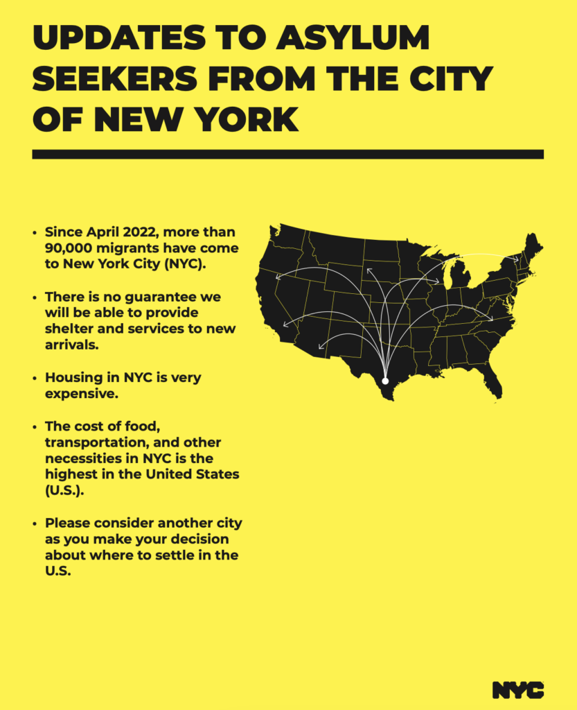 “Housing in NYC is very expensive,” the fliers said. “Please consider another city as you make your decision about where to settle in the U.S.”